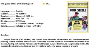 Summary: Lawyer Bowdre has started a war between the ranchers and the homesteaders planning to take over the homesteaders land when they are wiped out. Rancher Dan Stockton, having just married homesteader Gail Dawson, is caught in the middle. He suspects Bowdre is behind the war and it's not long before he gets a chance to prove it.