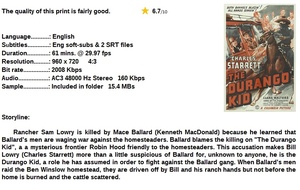 Summary: The first film in which Charles Starrett played an alter-ego character known as "The Durango Kid" but this entry, for all intents and purposes, has only the names of Starrett and "Durango" in common with the long (long, long) "Durango Kid" series Starrett starred in from late-1944, beginning with "The Return of the Durango Kid" until 1952. Rancher Sam Lowry is killed by Mace Ballard because he learned that Ballard's men are waging war against the homesteaders. Ballard blames the killing on "The Durango Kid", a a mysterious frontier Robin Hood friendly to the homesteaders. This accusation makes Bill Lowry more than a little suspicious of Ballard for, unknown to anyone, he is the Durango Kid, a role he has assumed in order to fight against the Ballard gang. When Ballard's men raid the Ben Winslow homestead, they are driven off by Bill and his ranch hands but not before the home is burned and the cattle scattered. Taking a shine to Winslow's daughter, Nancy, Bill masks himself as "Durango", strips Ballard of all his cash and gives it to the homesteaders. Ballard has U. S. Marshal Trayboe post a reward for "Durango", and Trayboe, wiser than Ballard gives him credit for, makes Bill a deputy charged with bringing "Durango" in. The Kid keeps taking money from Ballard and giving it to the homesteaders that have been burned out and hiding in Hidden Valley. Ballard kidnaps Nancy and sets a trap for Bill, whom he now suspects is "Durango". But, with the help of Marshal Trayboe, Bill escapes and kills Ballard, who boasted in front of Bill that he has killed the elder Lowry, in a gunfight. Bill Lowry officially retires as "The Durango Kid" and settles in on his father's ranch with Nancy,