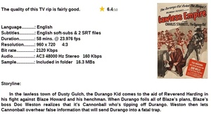 Summary: A band of raiders are about to run the Murphys off of their homestead when they are stopped by the Rev. Harding and his sister Vicky. Gang leader Duke Flinders is about to shoot Harding when the Durango Kid appears and runs off the outlaws. Steve Ransom is persuaded by the townspeople to beome their Marshal. He soon learns that saloon owner Blaze Howard and Doc Weston are behind the raids and plot to gain the homesteads.